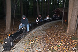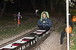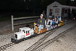 Renee Czak as conductor arriving back at the station with the led headgear, knew I was going to take a photo so she closed her eyes. With the run over some Park employees and volunteers get a ride through the woods. |