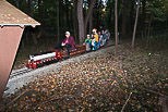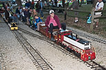 Paul Emch with his riders heads for Zip Junction as he passes the whistle post. Judson Elliott was next to pass by this location approaching the midpoint of the train ride. |