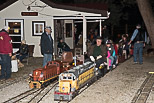 Frank Foti with East Wind emerging out from the Covered Bridge with his first trainload of riders for tonights run. A short while later Dick Clark emerges out of the darkness with his passengers. |