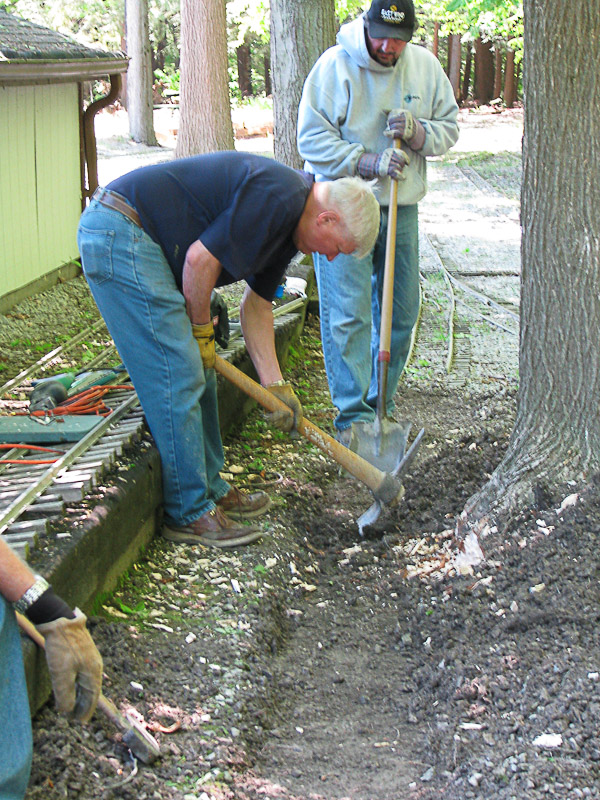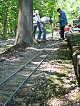Bob took a breather while John Koontz started chopping with a madic as Frank Foti removes some more existing ballast. With the offending root trimmed and the rest of the ballast removed, track panels were layed back in place and re- connected. |
