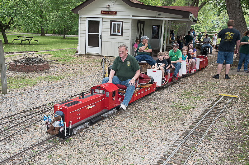 Dick Scott gives a thumbs up running the club's Nickel Plate Road switcher as he gains speed. Frank coasts to a stop at the loading area to pick up passengers bound for the great West and the land grab. |