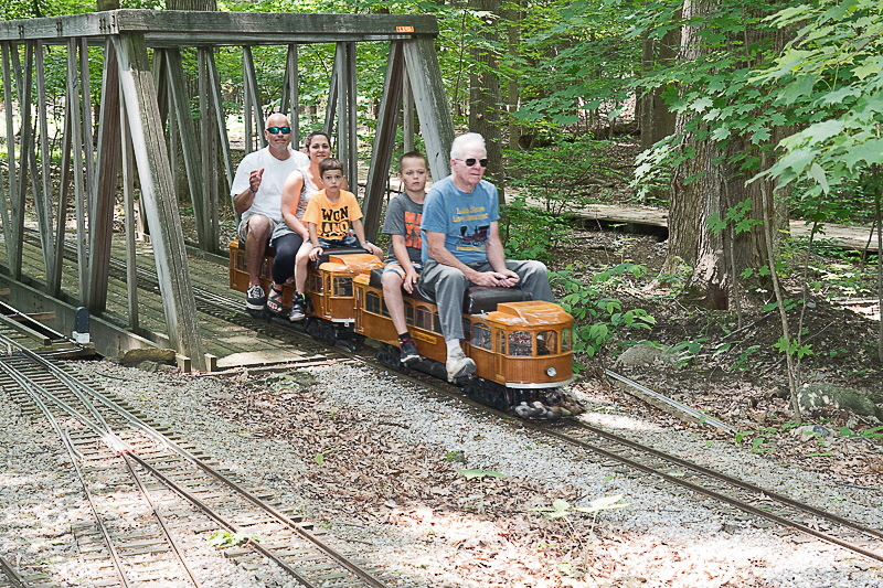 Ted with his interurbans and passengers as they emerge from the Truss Bridge heading for Mackeys Run. Ron Trenhaile, our train watcher in the chair, checks the trains as they pass by such as Paul's trainload as he heads for Mackey's Run. |
