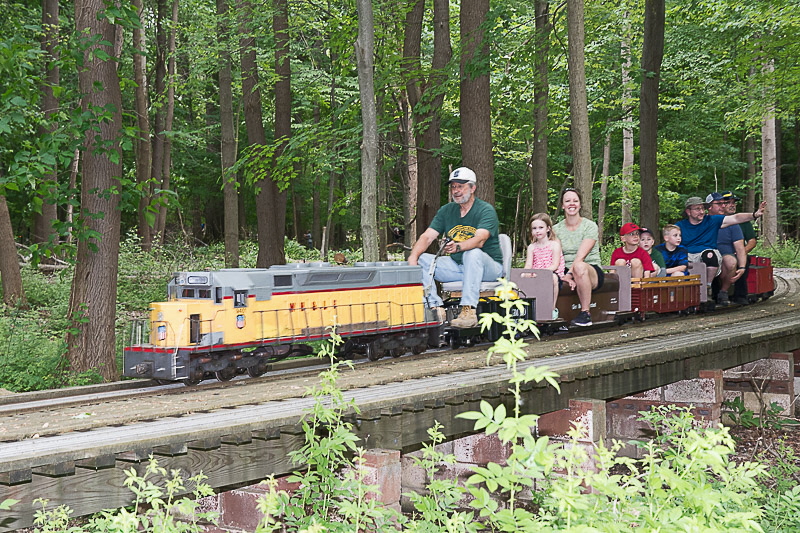 The trains are assembling at the loading area at the end of Shriver Station awaiting the start of our public run today. Ted Nyland giving a quest a ride is hemmed in at the station with the traffic ahead of him. |