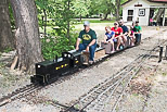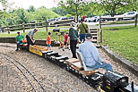 Mike Harkleroad finished loading riders on the train and has given Ken Brooks the "All Aboard!" call so he may move his train. Frank moves East Winds train towards the loading area with Frank Smoley behind him waiting to pull ahead and load riders. |