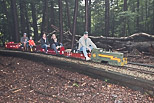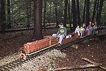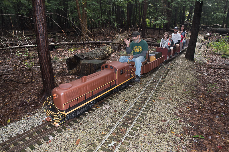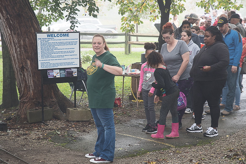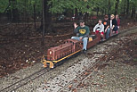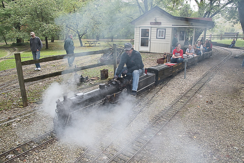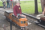 Jen Zorko, our club president, is our train loader on this foggy afternoon making sure the trains are loaded properly and giving riding instruction to the public. Ken just starts to put his train in motion after getting the "All aboard!" call. |