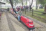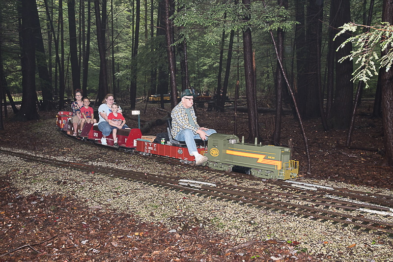 It rained during the night and early morning, but cleared out enough for our run as Dick Scott takes out his first load of passengers with the clubs GP38. Ken Brooks departs the station with his Morris engine that he recently acquired. |