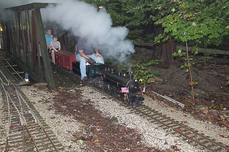 Mitch with his Pacific coming off the Truss Bridge in a cloud of exhaust vapor must have a hard time seeing where he is going. I guess it's difficult to see his passengers too as they emerge off of the bridge. |