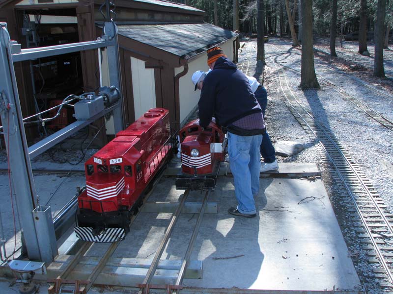 It was nice that Ken's bed liner has the ridges to guide the engine alonside of the work engine 101. Back at the track with both engines off loaded onto the lift and 101 moving off the transfer table. |