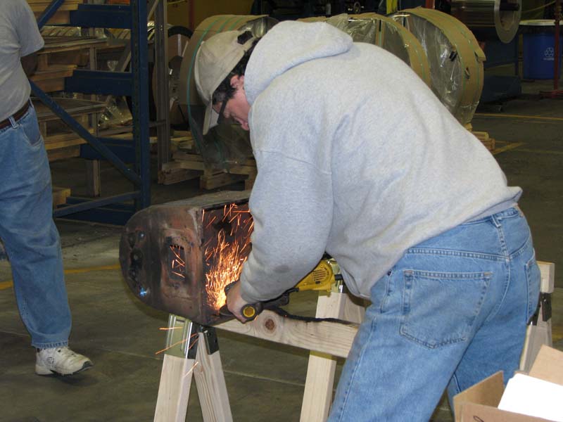 We loaded the Park engine and two rider cars that are slated to have brakes installed for the ride back to Hose Master. While we were gone Frank Foti continued to grind the old welds from the firebox that was cut out. |