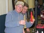 Joe Banzer,our retired chemist, concocts a special formula for the gas tank as George Woodling watches.As Joe adds the mixture to the tank George, Ken Brooks and Rick Nagy discuss the merits of the "madd" scientist. |