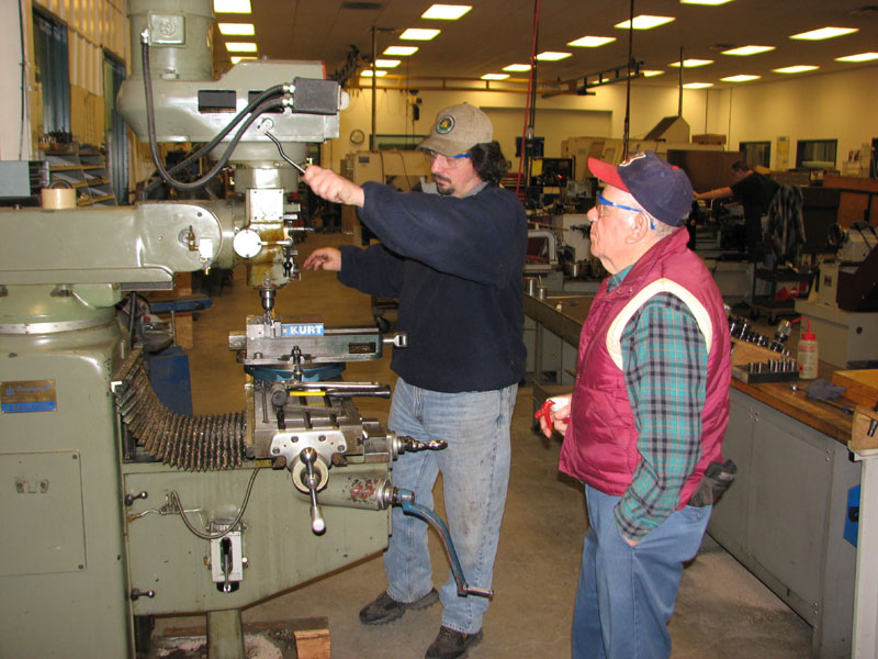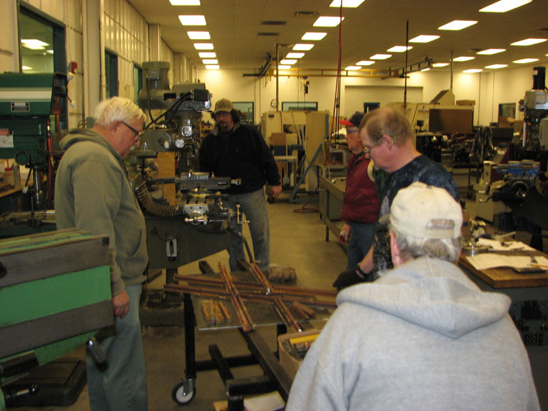 Frank Foti stops the spindle to check the test cut on the foot of the rail. George Davidson, Rick Nagy and Dick Clark look over the progress made as Frank and Lew in background work with the mill. |