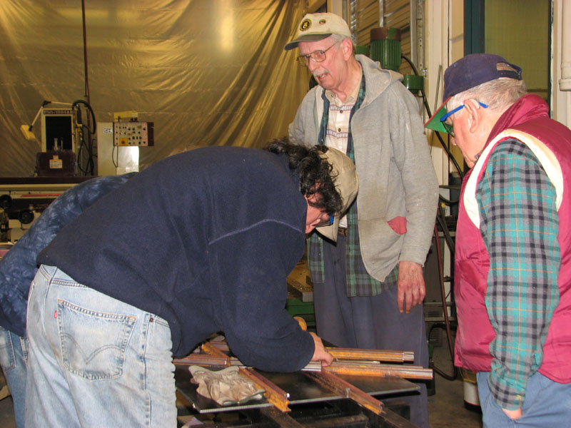 Rick is using a file to remove any burrs on the end of the rail after milling. Rick and Frank checking the fit of the guard rail as Dick and Lew watch. |