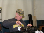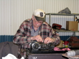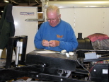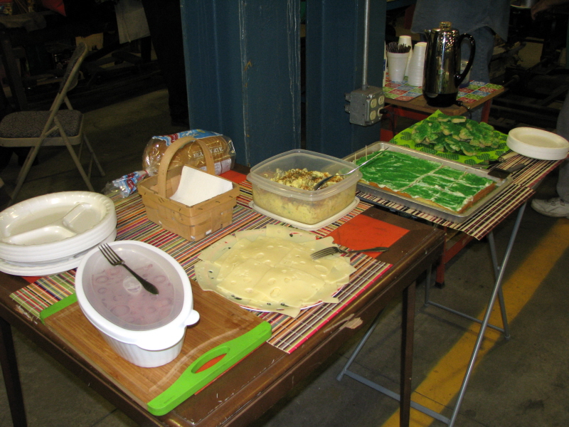 Bonnie Zaken had brought corn beef, cheese, potato salad and rye bread along with cake and cookies for dessert for today's meal. Dick Clark working on adjusting the cams on the brake linkage on the club's riding car. |