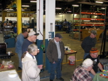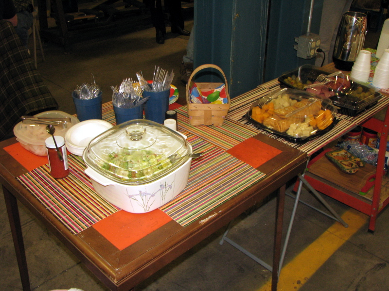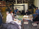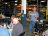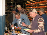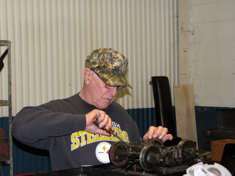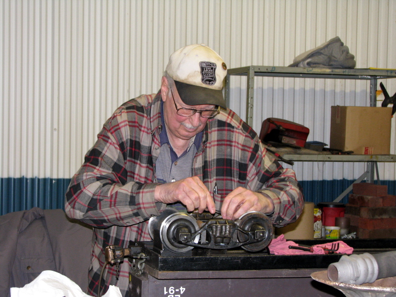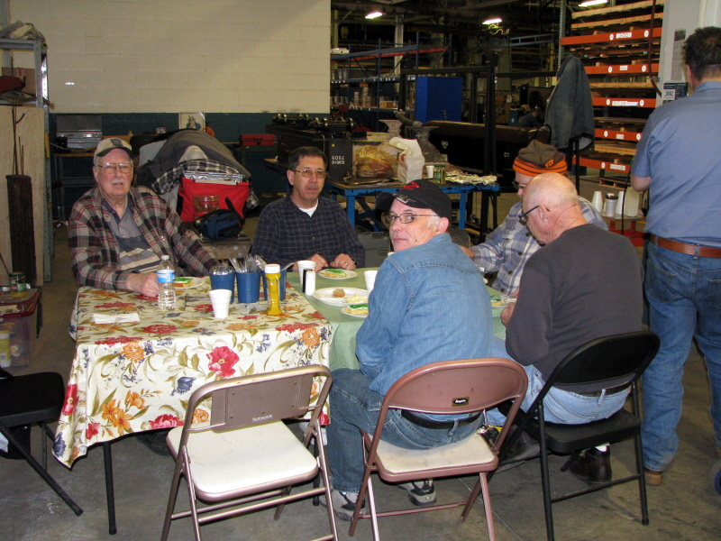 Frank Smoley is checking out the brake shoes and the springs in the side frames of the truck. Time to eat and Dick Clark, Wayne Boron, Dave Cryor, Frank Smoley, Rick Nagy are seated at the table with Aaron Slitz walking out of the picture. |
