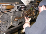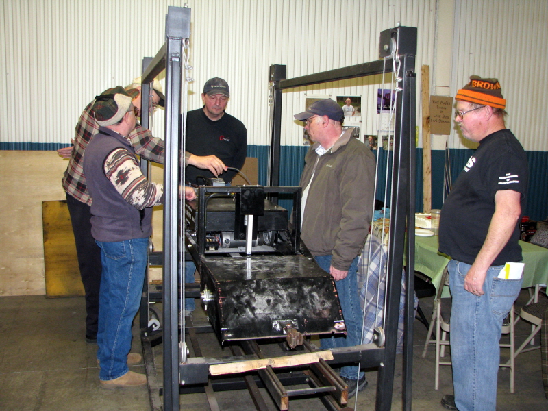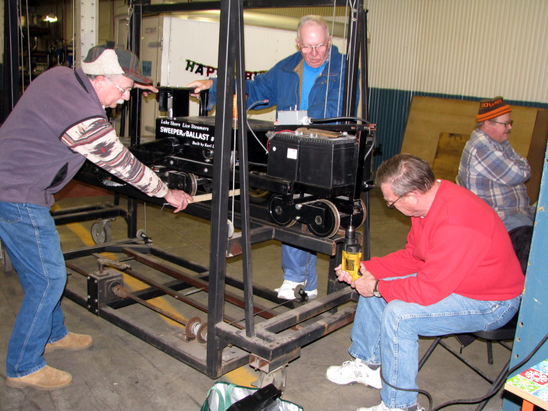 The crew transferred the ballast sweeper from the fixed stand to Frank's mobile lift in preparation for taking it back to the Park. As Wayne and Ted steady the sweeper Paul Zorko opens up the hole in the coupler pocket for a thru pin. |