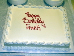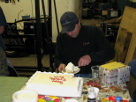 Dave and Dick wait as Steve and Wayne Boron load their plates with Bonnie looking on from behind them. After singing happy birthday to Frank he did the honors of cutting the cake. |