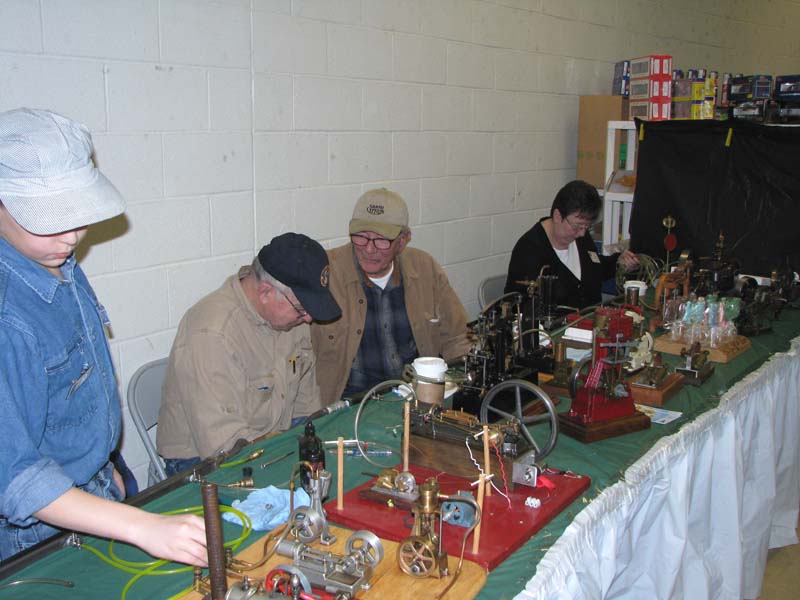 Dave Foster and Robbi Haines watched over the table top engines running on air and fielding any questions from the public. Some of the engines at their end of the tables even included a wooden steam engine. |