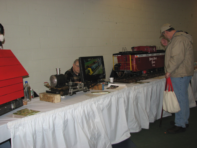 Bill Deptowicz brought in his scratch-built interurban chassis of the 150-159 class of Lake Shore Electric cars. Rex Shriver behind the monitor showing videos and Lou DeLembos' steamer that he is building. |