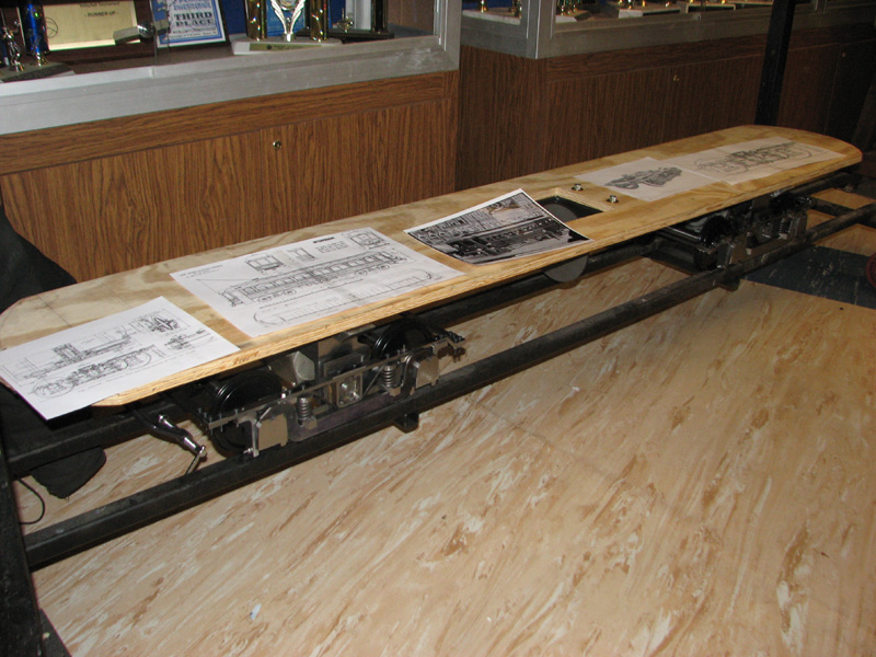 Bill's interurban chassis and the plan sheets and photo on display. "East Wind" said she is waiting for Frank to build a fire in her boiler and start our running season. |