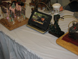 A view from the other end of the table showing the displays we had. Linda Harris seated behind the table with some of their engine collction. |