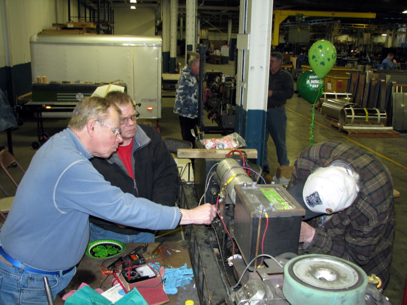 Joe Banzer and Rick Nagy working with the new air compressor mount for the air brakes. George Raby watches as Steve Zaken applies the primer paint under Bonnie Zaken's watchful eye. |