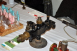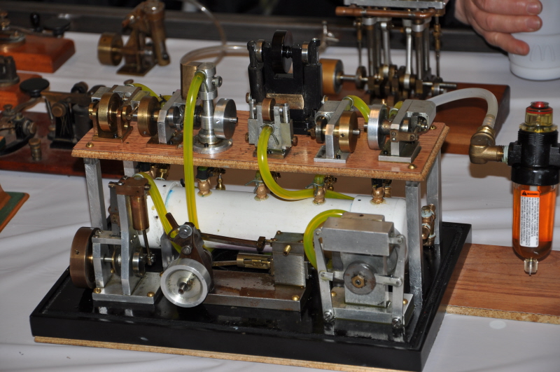 A close up view of the telegraph keys and small machine shop models of equipment included in our display. The telegraph key hooked up to the battery so they could operate it, was a hit with the kids. A close-up of a variety of working steam engines running on air made by George Metts. |