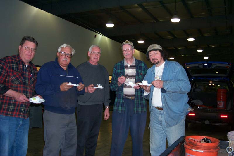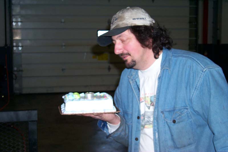 Track Crew 7 met at Hose Master once again but this time took a few minutes to celebrate Frank Fotis' birthday. Frank closed his eyes as he blew out the candle. The cat was the ornament for the cake. |