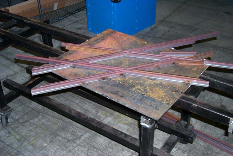 The last guard rail is welded in place and now we turn the plate over to weld the rail where it extends past the plate so the rail won't roll sideways if a derailment occurs. |