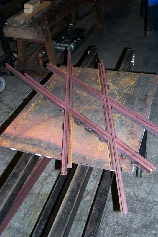 You can see by this overhead photo of the crossing that the guard rails haven't been bent yet. In this view you can see how the foot of the guard rail was milled off for clearance. Welding the rail to the plate to hold the alignment was a great idea. |