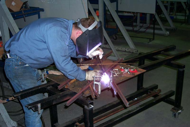 Chris and George clamp down the guard rails prior to welding with the required 1/4 inch spacer for wheel flange clearance. Chris starts TIG welding the guard rail down to the 1/4 inch plate |