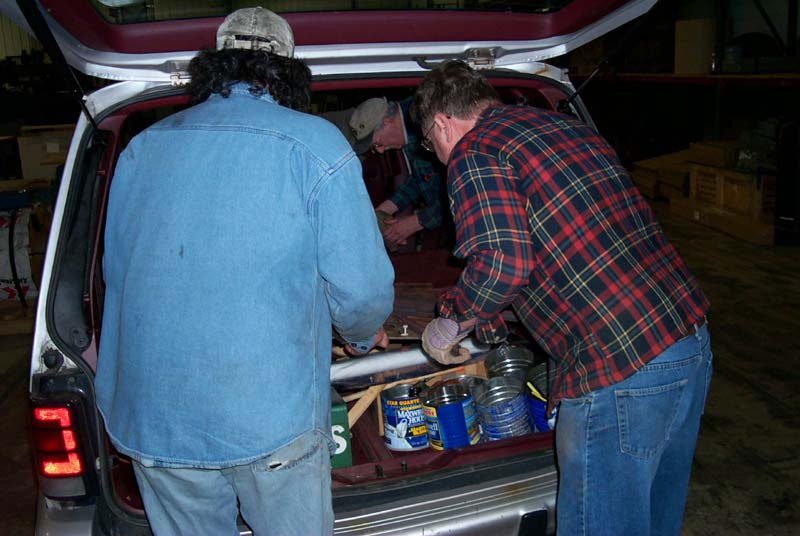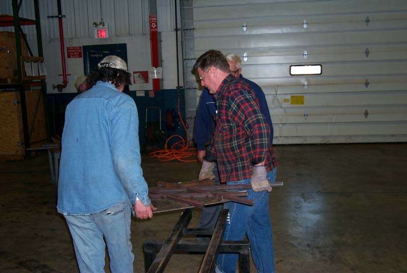Frank and George carry the crossing to Dick's van and load it in. We are getting pretty good at making these and it's a big help that Dave Foster provides the full size layout drawings that we transfer to the plate. |