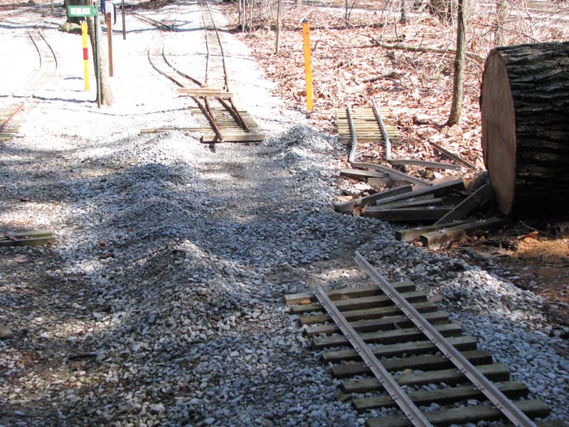 Rick Nagy and Ted Nyland take the switch apart to replace the parts that were damaged when the tree at the left fell on the tracks. It turned out to be more work than they figured to replace the parts and rail on the switch. |
