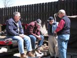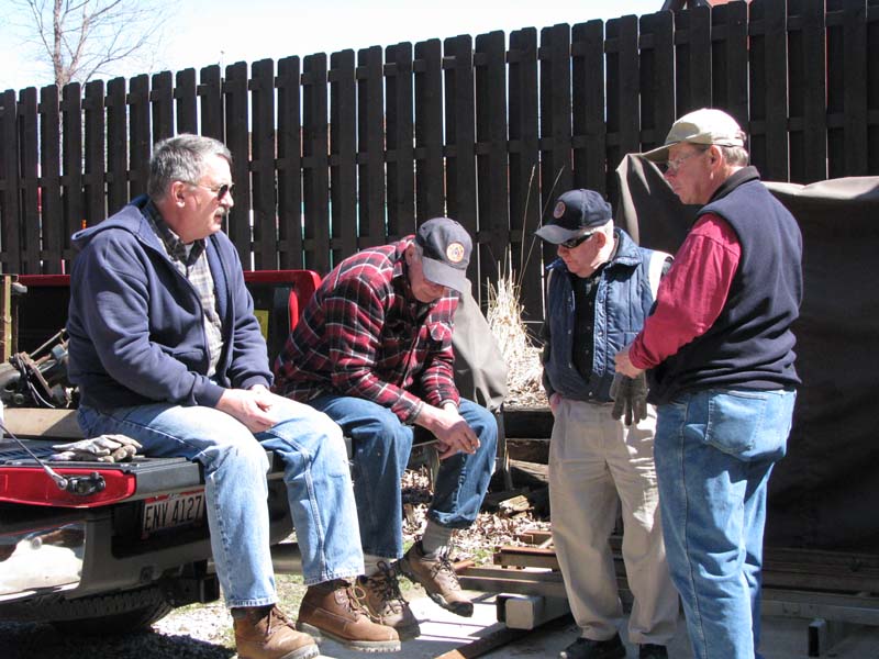 Ken made another trip back to Hose Master to bring the club and Park engine back. Dave, George, Lew Fowler and Joe Banzer taking a few minutes after off loading the engines. |