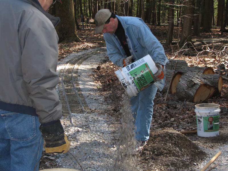 Dick Clark stopped by and is "smoking" a candy cigarette as he talks with Ed Fincher and Don Speidel. Frank dumping a bucket of ballast gravel on the track that was just fastened down to the ties. |