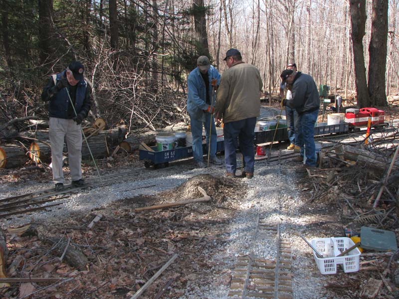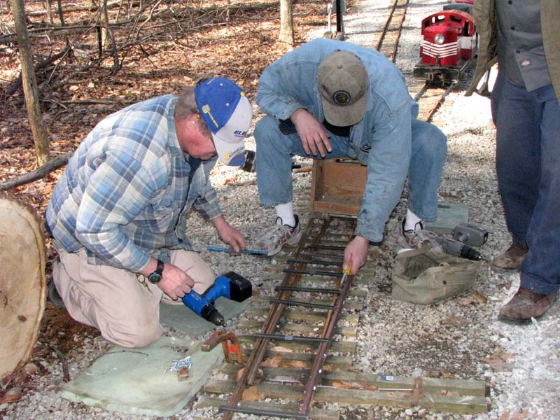 Tom, George and Lew work on the track leading up to the damaged switch. Rick and Frank using track gauges to keep the replaced rail sections on the switch in gauge. |