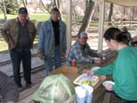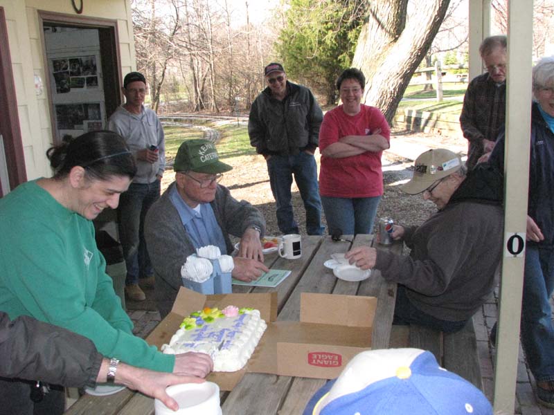George, Frank and Rick watch as Pam Znidar prepares to cut the cake. As Pam cuts the cake, Dominic, Don, Tom, Robbi Haines, Rex Shriver, Jerry Bell and Kitty wait patiently. |
