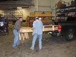 Dave, Frank Foti and Ken slide the switch building jig onto the bed of Ken's truck. George Metts and Tom Reder watch as George Woodling and Ken unload the wooden straddle riding car back at the track. |