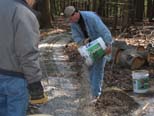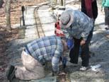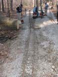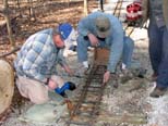 Tom uses the tie lifter as Frank drives in the screws to hold the rail in place. That'll teach him, Bill Deptowicz just wacked Frank over the head with a piece of ten foot long aluminum rail. The tree did the damage not Frank's head. |