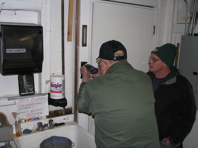 At one of our meetings it was voted on to buy 6 new fire extinguishers to replace our aging ones we had. Ken reaches for one of the straddle riding cars to pull it off his truck as Frank and Dick watch. |