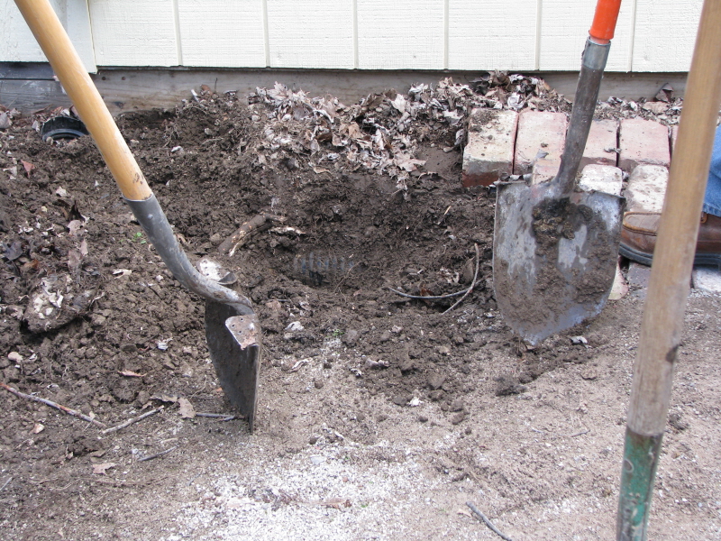 Steve and Ken take a breather after finding the pipe on just on the other side of the track now that they knew the general location of the pipe run. Steve and Dave dig on this side of the track to find the pipe that runs into a French drain. |