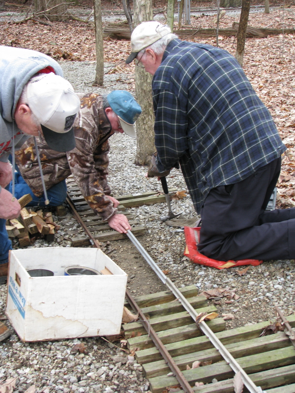Dick, Ken and Wayne continue to place the ties under the newly placed rail and screw them down with the gauge blocks on the rails. I wonder if Rick is going to feel good from all that vibration on his back for hours on end, or if he's going to ache like crazy. Thanks Rick. |