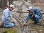 Ken files off any burrs on the end of the aluminum rail after it was cut to length so their rail joiner will easily slide on for the steel rail to aluminum splice as Dick places ties under the rail. At Zip Junction, Dave Hird was cleaning out one of the switches we have at the grade crossing that always seems to accumulate mud. |