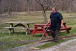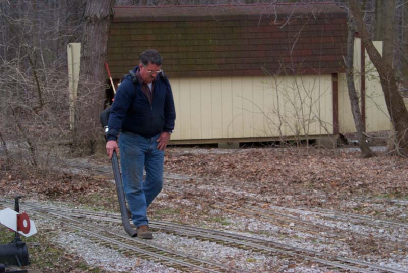Mark Ross getting gas for the club's hand held blower. Looking down at the clips that support the short section of rail for the transfer table lift for the elevated storage track. |