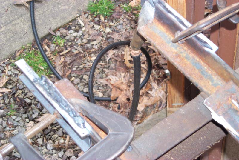 After grinding off the welds on the old clips George Metts and George Davidson clamp short sections of 2" channel to the ends. The ground clamp from the welder is attached. |