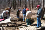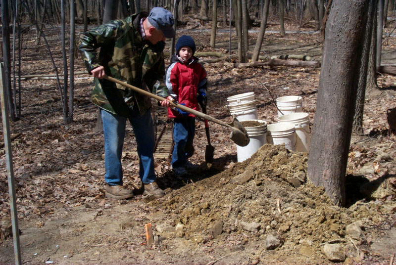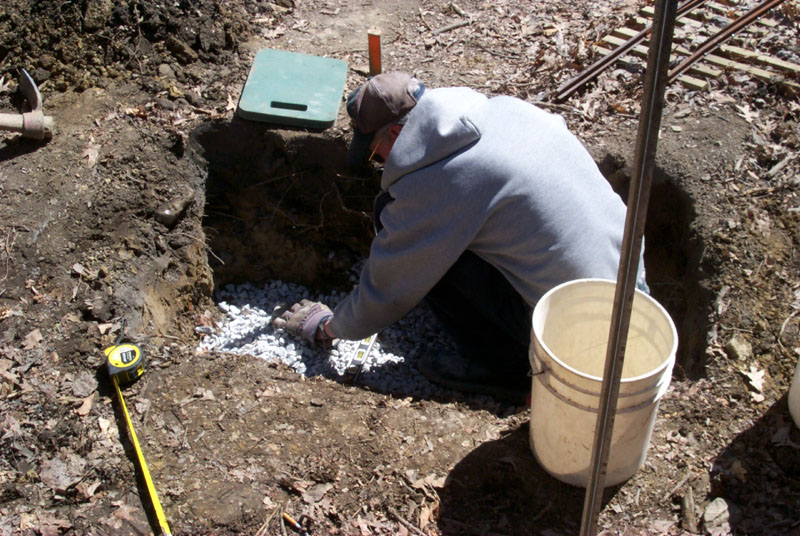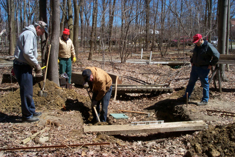 Contemplating if the second hole is deep enough. Dick checking with a level if the gravel fill is ready for the placement of the cedar abutment beam. |
