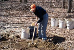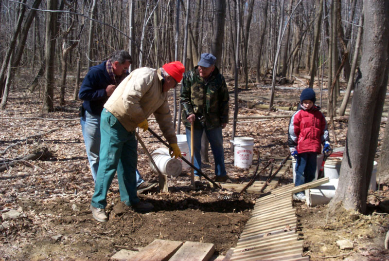 Edith Hacker works at filling the buckets along with Lou DeLembo and our newest junior member, Lou's grandson, Ian Fogelman. Dirt will be used for fill along the tracks. |