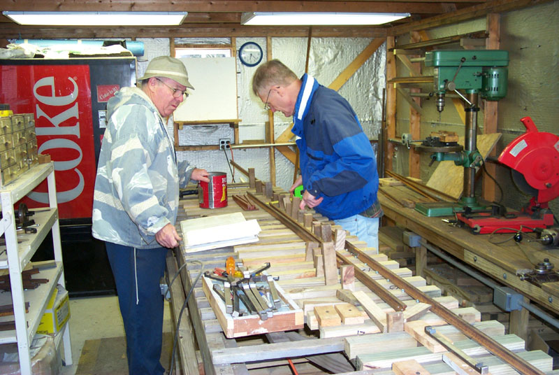 Ted Nyland and Jerry Bell working in the switch shed to fill Dick Clarks order for switches this year. Ron Trenhaile was digging to bury cable from a remote switch stand for the turnout at Short. |
