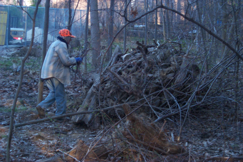 Jonathan Shaffer, Dick Clark and Tom Reder discuss the tighting of the rail clips at the splices. Edith works at clearing the branches that have fallen. |