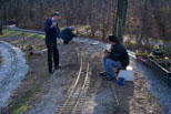 Tamping ballast between rails & checking out superelevation on the curve |