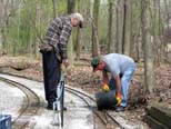Mark Ross working on freeing up the throw on a switch near the yard. George Metts and Bob Pekeltis head for the station for a coffee break. |